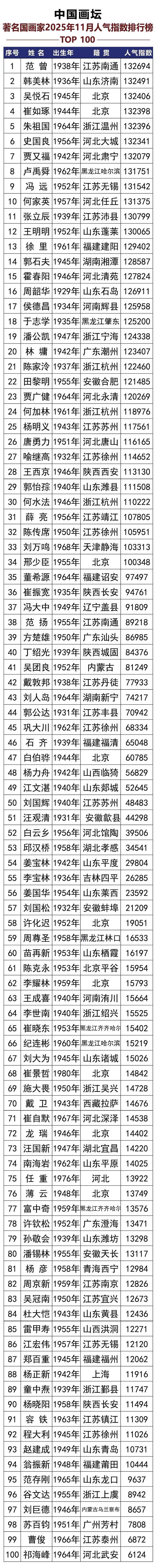 由权威门户中国大型艺术网站,依据行业众多专家等组成专业评审团,通过对各位入选画家被社会大众的关注度、各种数据评审和调研等形式,以及从画家的绘画艺术创新、藏家反应、市场动态、本人知名度、画家品德等八大维度进行专业的数据筛选,分析,慎重洞察评选后,隆重推出中国画坛著名国画家2025年11月人气指数排行榜重磅发布。