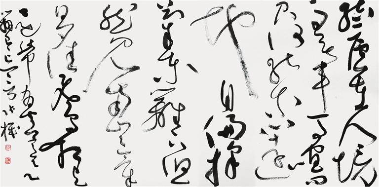 张机的艺术风格,可以概括为四个字:清、雅、奇、厚。从他十多年前的“写意王献之”到近年的“陶渊明饮酒横?”和“文天祥诗立轴”,再到近期的“传家处世”和“碑刻学术”两副对联来看,这些作品都是他某个时期的代表作,其笔法娴熟,体势多变,墨色丰富,章法自然,可远观亦可细品。张机说,“我的艺术风格,是在我长期的艺术审美和生活感悟中慢慢形成的,取法之正谓之‘清’,书卷之气谓之‘雅’,文人之趣谓之‘奇’,尚古之情谓之‘厚’。”这是张机对自己艺术风格深刻的理解与阐释。纵观他的草书,有这样几个特征:第一,篆籀之法,他将篆隶笔法的浑厚古拙用到了草书中;其二:不追时风,时刻保持独立思考;其三,他通过传统的笔法线质,空间造型,章法气韵营造出一种极具现代审美意义的艺术作品。(胡抗美)