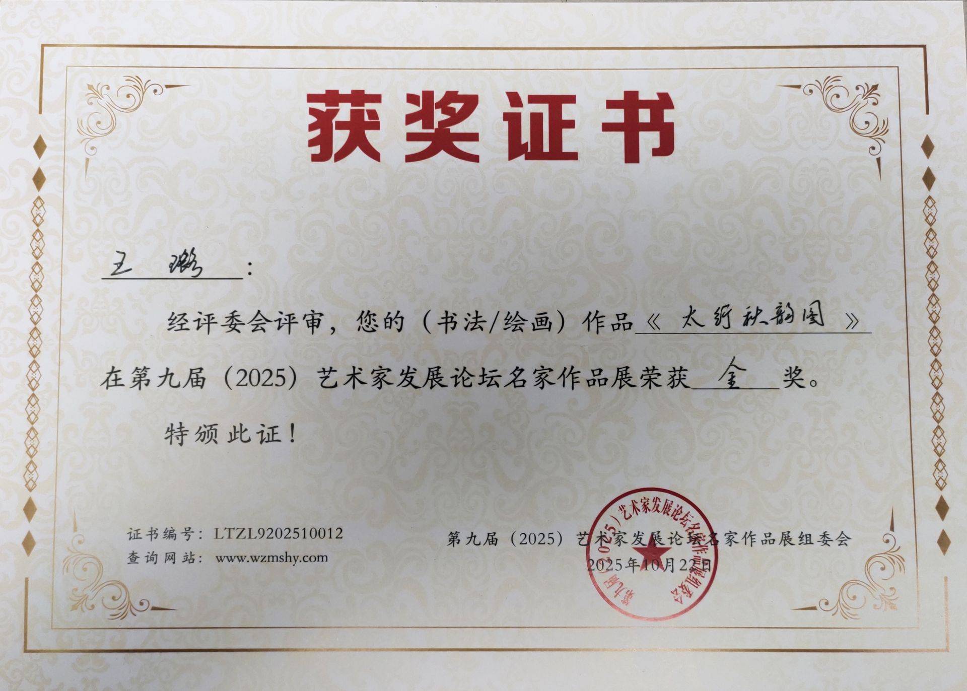 2025年10月22日,第九届艺术家发展论坛暨名家作品展在张家界隆重举行。著名画家王璐作品《太行秋韵图》荣获金奖。